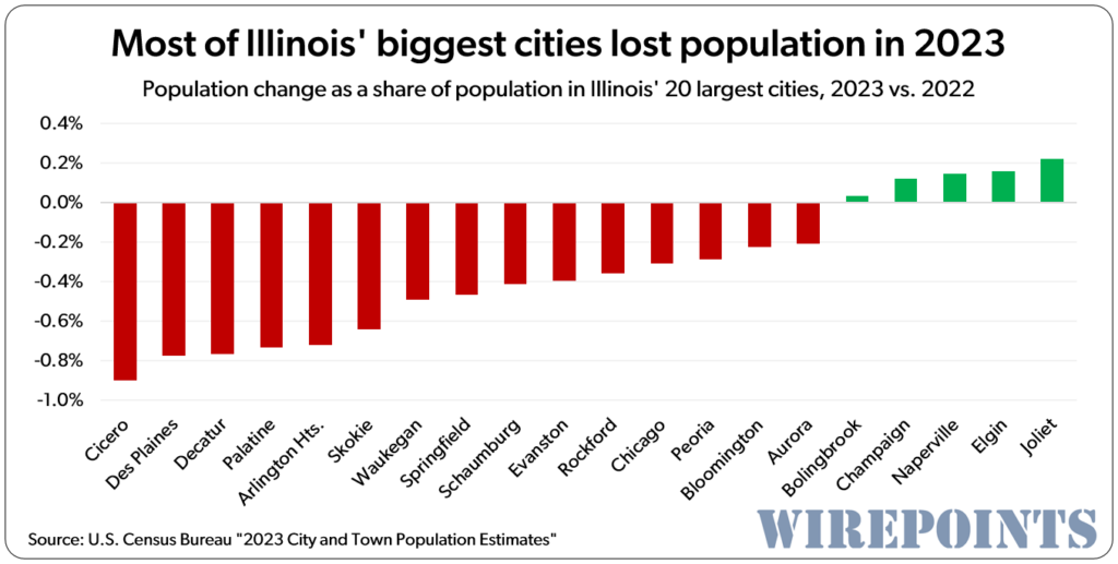 Economic growth in Illinois’ metro areas has been sucking wind for a long time. Start with Bloomington, which suffered the worst GDP performance of any metro area in the nation between 2019 and 2023. With a drop of 17% in real economic output, it’s dead last among the 384 metro areas the federal government tracks.