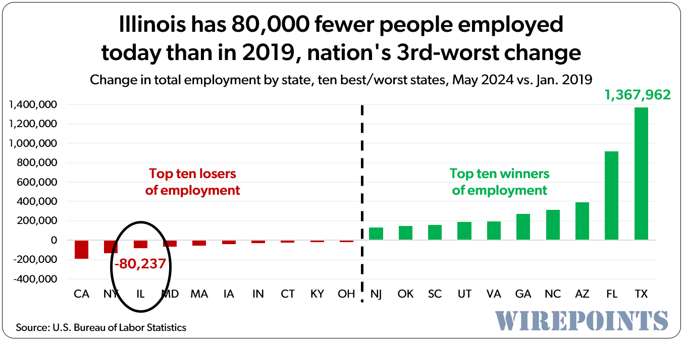 The BLS just released its finalized employment numbers for 2024 so we can now do a full review of job creation under Gov. Pritzker since 2019. Illinois had fewer private sector jobs over the period, losing a total of 1,900 total jobs. It was the nation’s 5th-worst performance. Compare that to the net new private sector jobs created in Texas: 1.2 million.