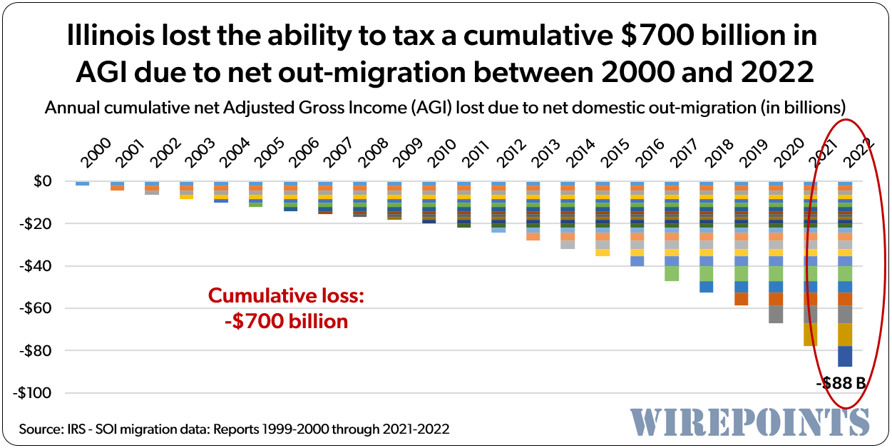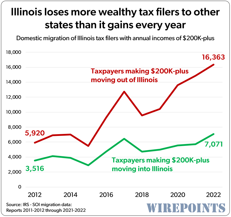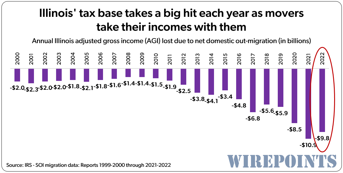 Whether they’re doing it on purpose or out of just plain ineptitude, Illinois’ political leaders have been slowly destroying this state. What we’re talking about is all the wealth the state is giving up by pushing wealthier taxpayers out and inviting less wealthy people in. Not to mention the flood of illegal immigrants that have been “welcomed” to Illinois, many fully dependent on the state.