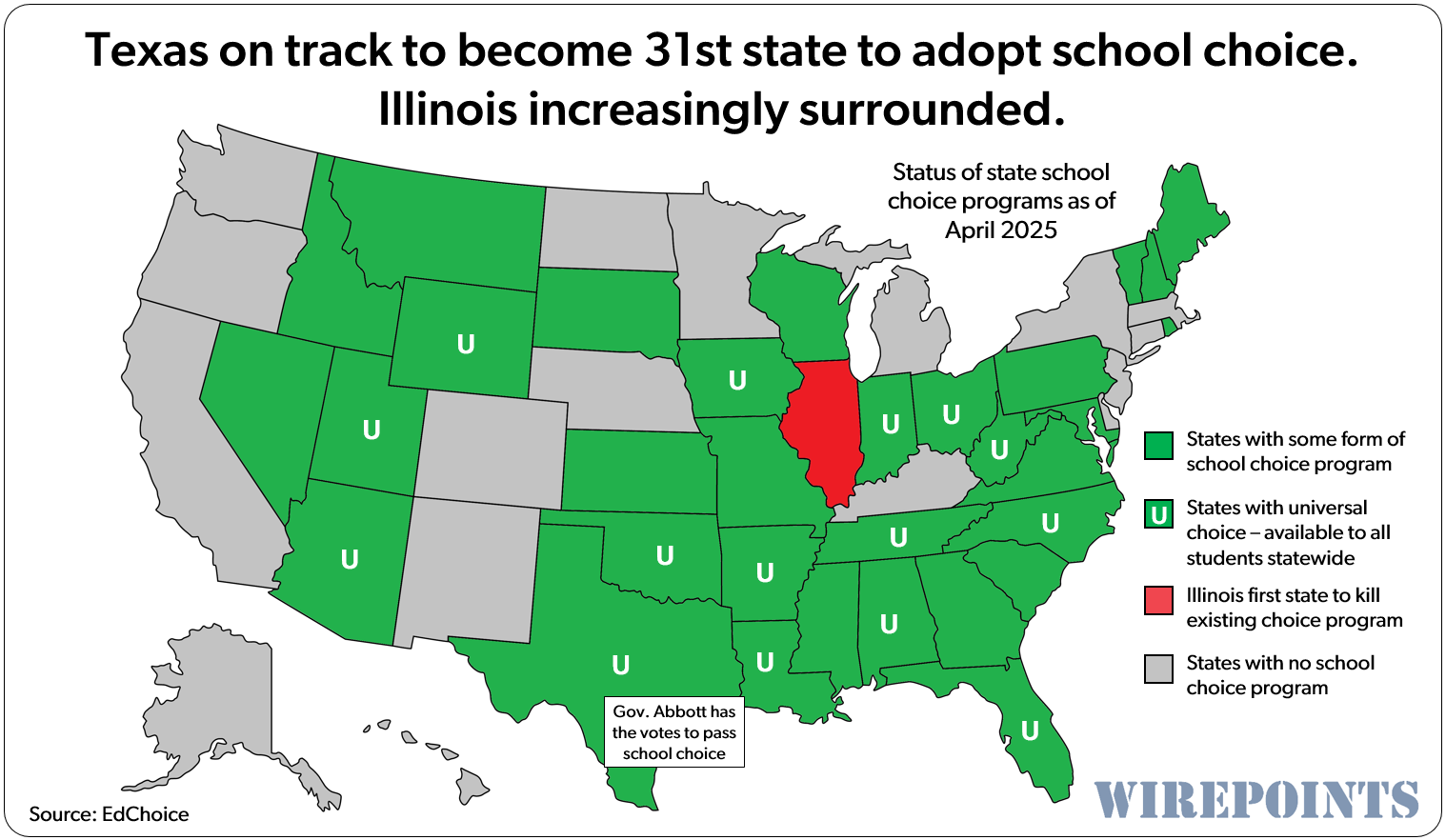 In what should create envy in many Illinois parents – especially those with children trapped in schools where not a single student can read at grade level – Texas Gov. Greg Abbott signed on Saturday the nation’s largest day-one school choice program into law.