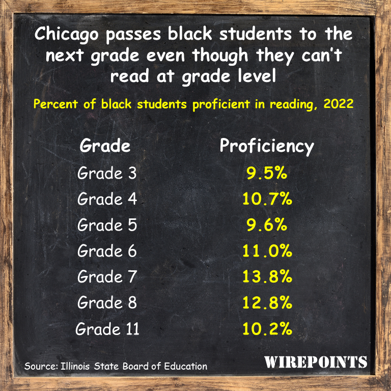 The result? By high school, just 9 of every 100 blacks graduating in Illinois could read at grade level in 2022. For Hispanics, it was just 13 of every 100. And results for math are even worse.