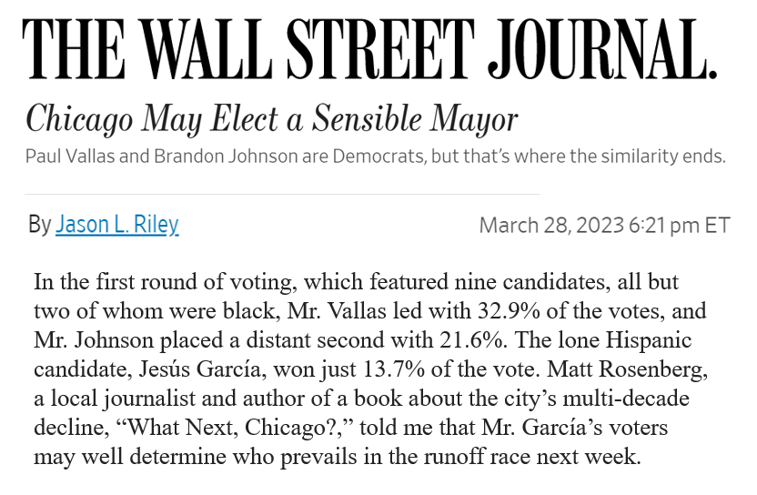 The Wall Street Journal journalist Jason L. Riley cited Wirepoints’ Matt Rosenberg in his new piece about the Chicago mayoral election. Matt said that next week’s election may well hinge on Hispanic voters and their opinions on the city’s crime wave.