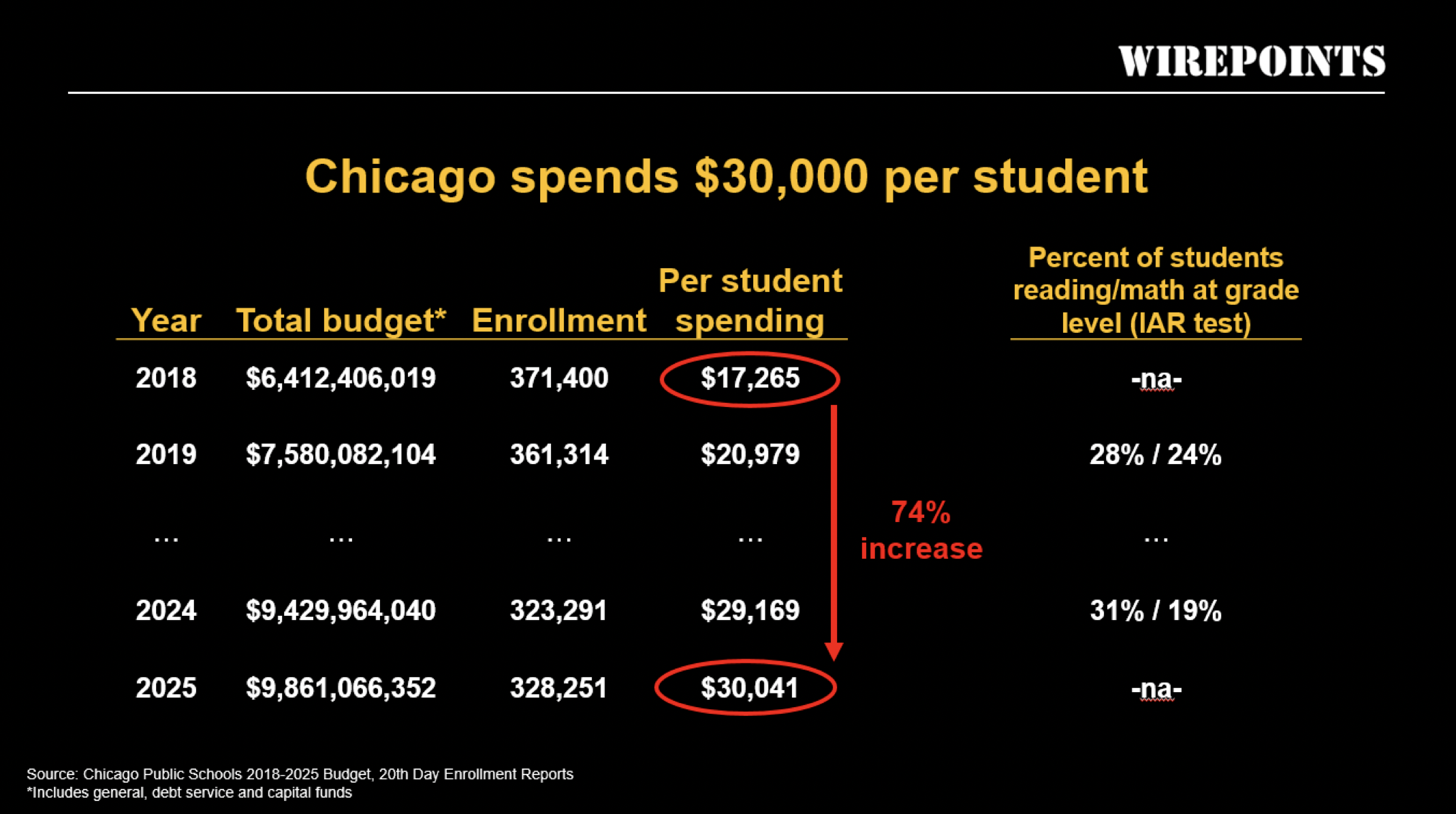 - All-in, Chicago Public Schools will spend over $30,000 per student in 2025, up 74% since spending $17,265 in 2018.