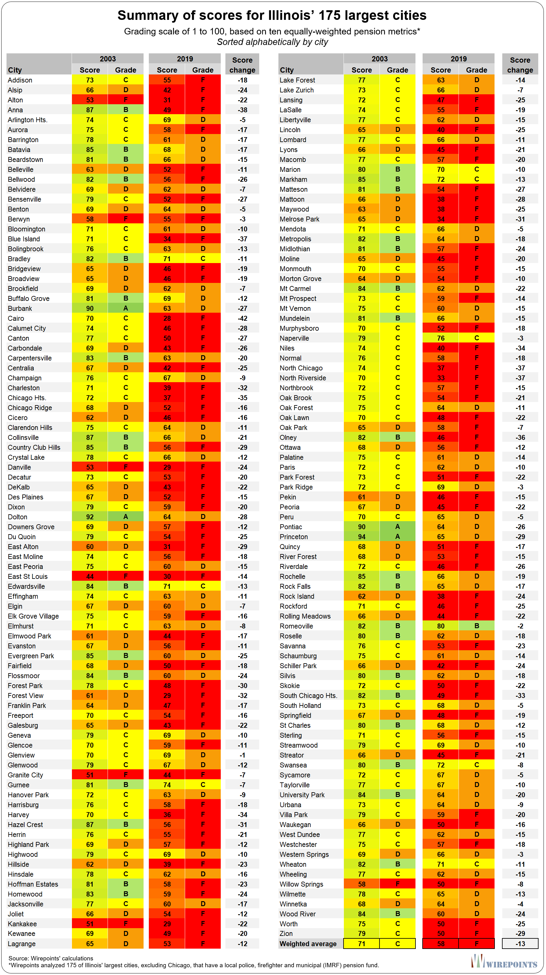 To track how much worse the local pension crisis has gotten over the past decade and a half, Wirepoints graded cities based on their financials in 2003 and 2019. Wirepoints chose those years because they are the earliest and latest years for which full individual police and firefighter fund data is publicly compiled by the Illinois Department of Insurance.