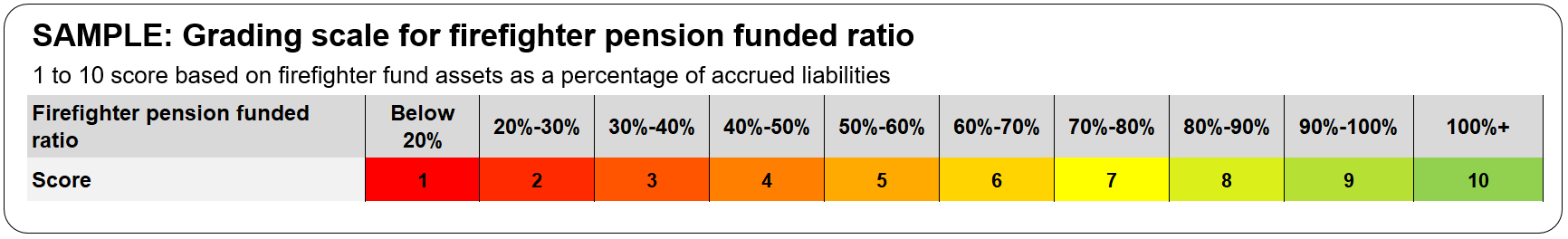 A city with a firefighter funding ratio of 65 percent, for example, receives a score of 6. Any city with a funding ratio below 20 percent receives the worst possible score of 1.