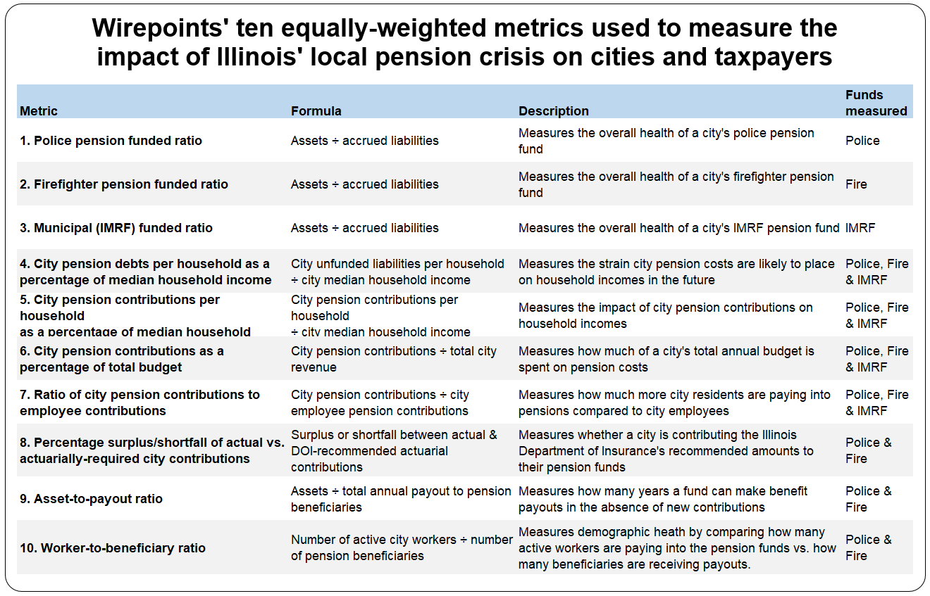 Wirepoints’ analysis used ten separate metrics related to pension fund health, taxpayer burdens and city costs in an attempt to comprehensively capture Illinois’ local pension crisis. We recognize our methodology is just one of many ways to measure the depth of the crisis.