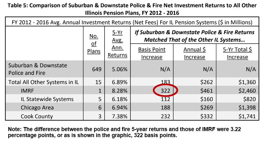 Note: The task force reached that $500 million amount by comparing the public safety fund returns to the Illinois Municipal Retirement Fund (IMRF) returns over the recent 5-year period. However, it’s not a proper comparison. The IMRF is 91 percent funded. In contrast, the public safety systems are only 55 percent funded in total. That includes 99 individual funds that are each less than 40 percent funded. That means the new consolidated funds won’t be able to take on as much risk as IMRF can, as they’ll need to keep more liquidity for payouts to current retirees.