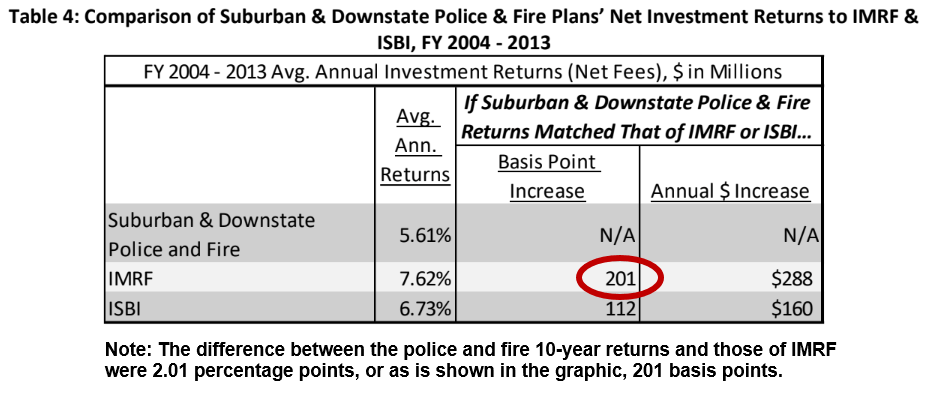 How much more will consolidating the roughly $15 billion in assets help the funds earn? Pritzker and his task force claim consolidation can help earn up to 3 percentage points more in yearly returns compared to what the funds have been earning recently (see note below for details). That’s $500 million more in income each year. The windfall is significant – the equivalent to half of the nearly $1 billion local taxpayers pay to the public safety funds today.