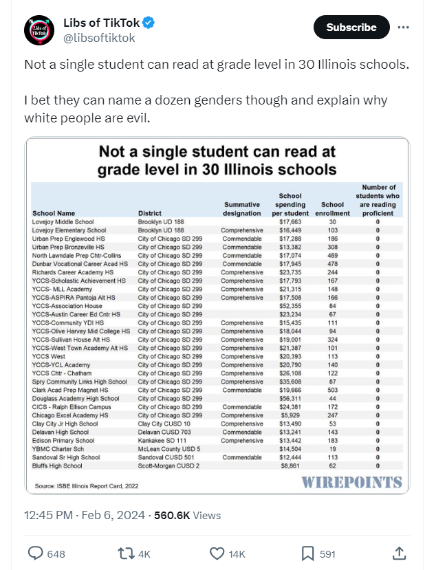 “Not a single student can read at grade level in 30 Illinois schools. I bet they can name a dozen genders though and explain why white people are evil” wrote the Libs of TikTok.