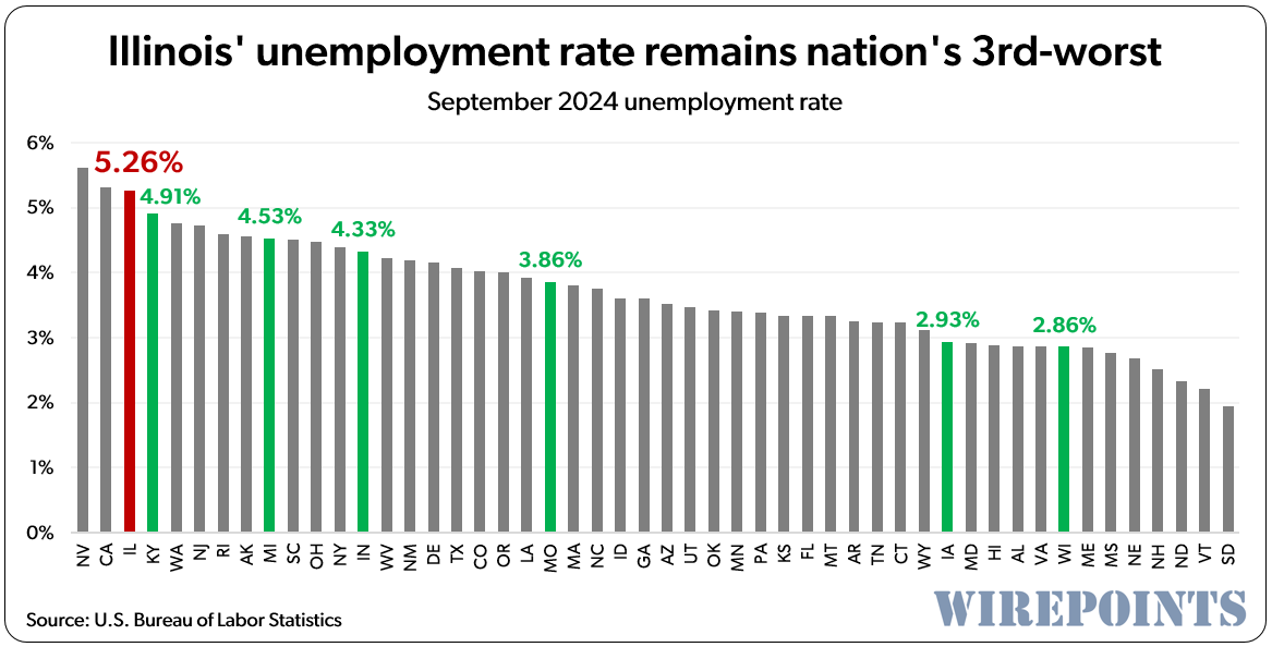 Illinois’ unemployment rate also remained one of the nation’s worst. At 5.26%, Illinois’ rate ranked third, behind only Nevada (5.62%) and California (5.32%). The national average for September was 4.1%.