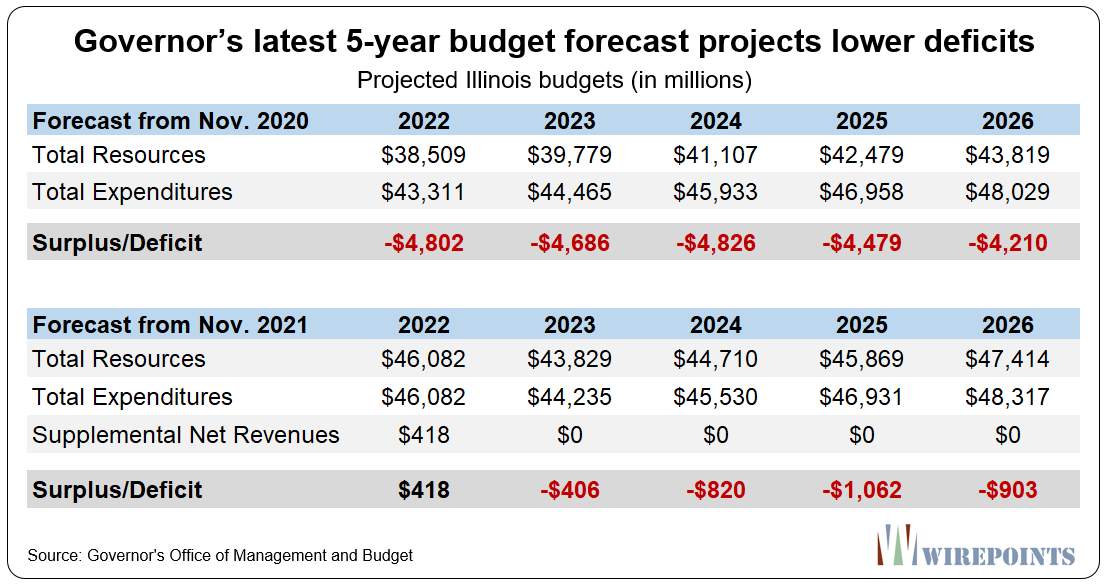 The result of all that is the Governor’s updated 5-year forecast that shows Illinois with a $480 million surplus for 2022 and yearly deficits of anywhere from $400 million to $1 billion over the next five years. Those deficits are far better than the ones projected last year, which had put the 2022 hole at $4.8 billion and the yearly shortfalls at more than $4 billion each last year.