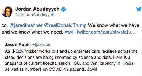 And now Pritzker’s media team has taken to Twitter to brag about their prowess with science and data based on the numbers they had to be pushed to collect. They went further and used those figures as part of Pritzker’s tiresome squabbles with the Trump Administration. Pritzker’s press secretary sent this tweet, along with the tweet shown from her deputy: