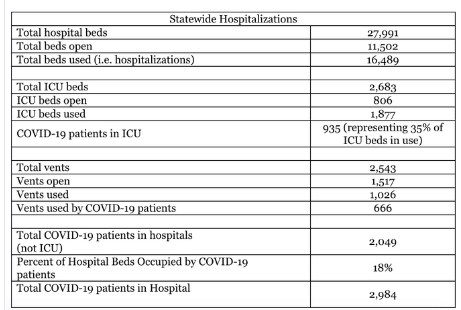 Intensive care beds, however, are tighter, and that’s where attention appears needed. The new numbers show 806 ICU beds now open and the projection shows a shortage of 507 ICU beds at the peak.