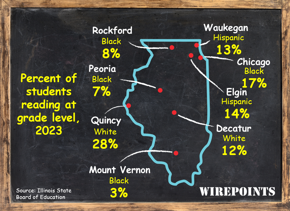 That’s particularly egregious given that, as we’ve shown time and again, Illinois’ student outcomes are beyond dismal. 1.2 million Illinois children can’t read at grade level. In Peoria, just 8% of black students are proficient in reading. In Elgin, it’s just 14% of Hispanics. In Decatur, just 12% of whites can read at grade level. And in Chicago, it’s only 17% of black students.