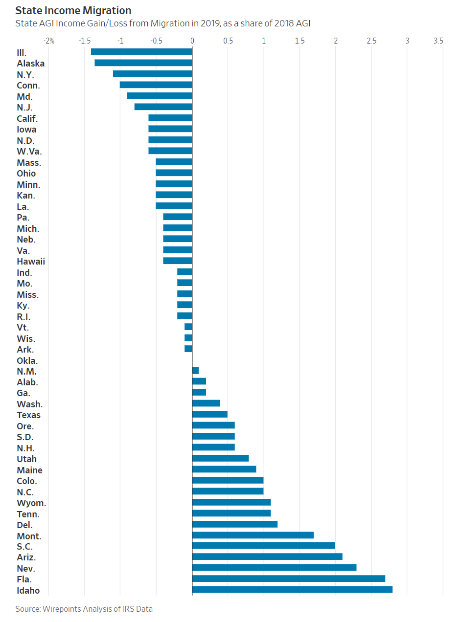 The Wall Street Journal featured Wirepoints’ research from “New IRS data reveals which states won and lost the competition for people and their wealth in 2019” in their opinion section this week.