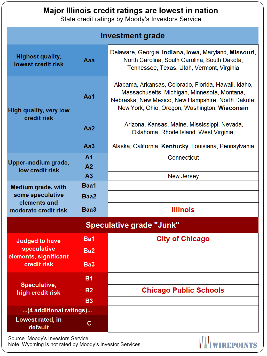Chicago and CPS are in even worse shape. They are both junk rated, with CPS deep in junk territory. If Illinois doesn’t collapse on its own, count on Chicago to bring down the entire state.