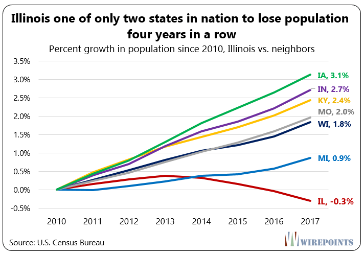 The net result is that Illinois’ population has actually declined four years in a row, an outcome shared only with struggling West Virginia.