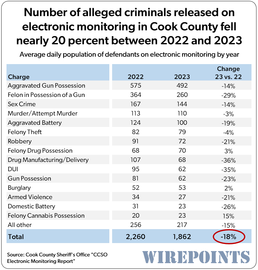 But if Cook County’s jail population is down and the number of defendants on electronic monitoring is also down – at the same time that violent crimes have just hit post-covid highs – then it’s not an unfair conclusion that more violent criminals are out on the street.