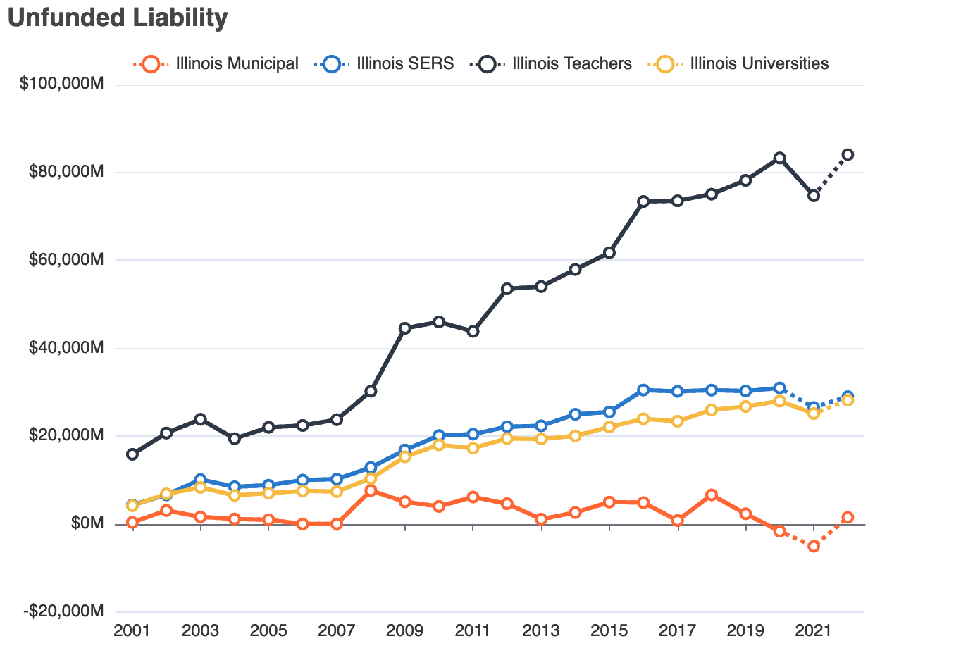 The Reason Foundation’s chart shown here highlights how unfunded liabilities have risen for Illinois pensions over the years, and the likely increase assuming a 6% loss on assets in 2022.