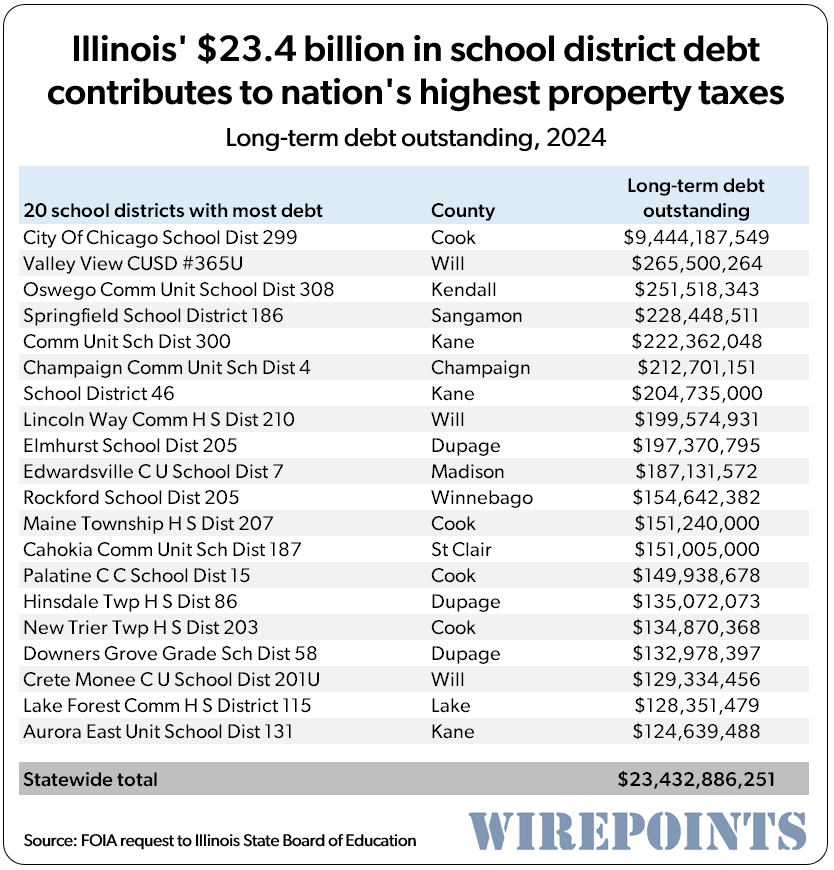 Illinois school districts already burden taxpayers with a whopping $23.4 billion in school district debt, equivalent to about $12,600 for every student in Illinois. It’s another reason why Illinois property taxes are the highest in the country.