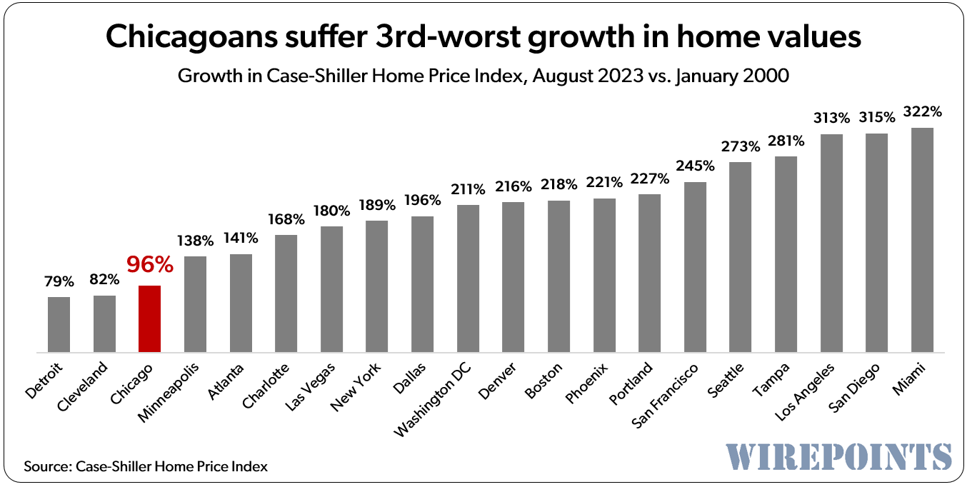 The fixed costs of Chicago’s pension and general debts makes the city uncompetitive vis-a-vis the nation’s other big cities. Those costs will continue to negatively impact taxes and services, further pressuring the city’s out-migration, home values and quality-of-life issues.