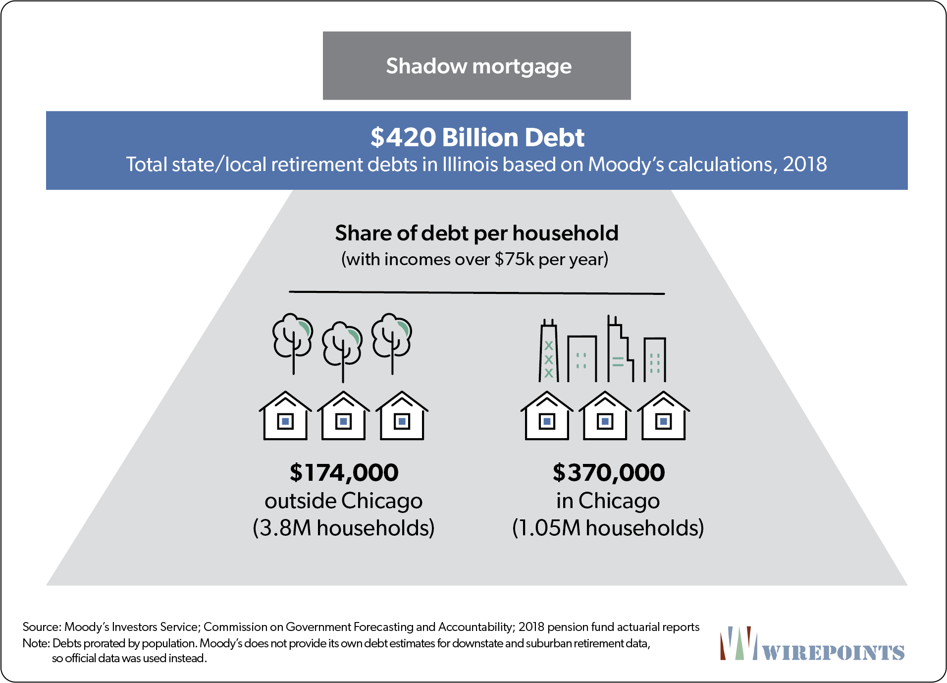 When the burden of that $420 billion debt is placed solely on those households earning $75,000 or more, Chicagoans are saddled with $370,000 each. And non-Chicago households are on the hook for $174,000 each.