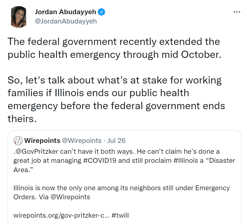The Pritzker administration fired back at Wirepoints last week. The emergency rules were needed, Pritzker spokeswoman Jordan Abudayyeh claimed on Twitter, so Illinois can continue to receive extra federal relief for Medicaid, food stamps, and the pandemic. The rules add flexibility to telehealth, she added, and insurers and Medicare must continue to cover the cost of Covid tests.