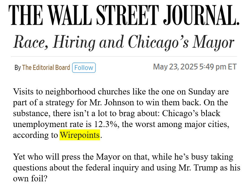 The Wall Street Journal Editorial Board cited Wirepoints’ analysis of how Chicago is delivering poor results to its black residents in its piece describing Mayor Johnson’s hiring practices and how they led to a DOJ investigation.