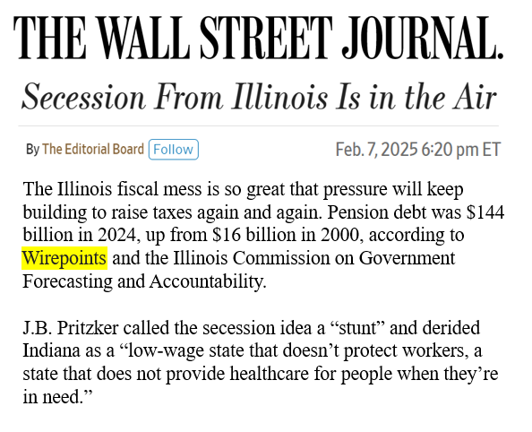 The Wall Street Journal Editorial Board cited Wirepoints’ analysis of Illinois’ massive pension debts as part of their piece detailing the growing secession movement in downstate counties and Indiana’s offer to absorb those counties. As the Board says: “when he runs for President in 2028, perhaps Gov. Pritzker can explain to voters why so many of his citizens want to flee his brand of tax-and-spend governance.”
