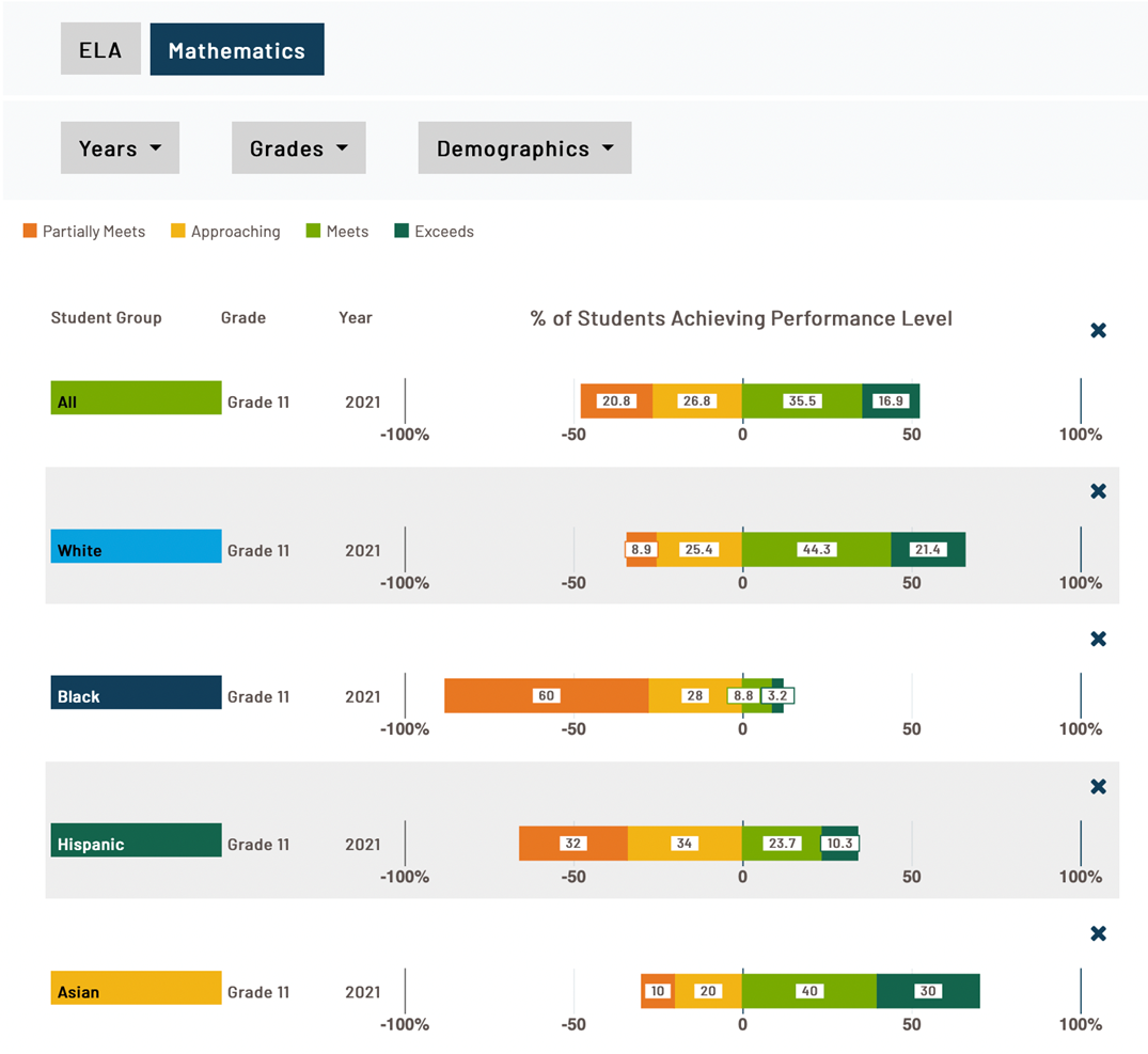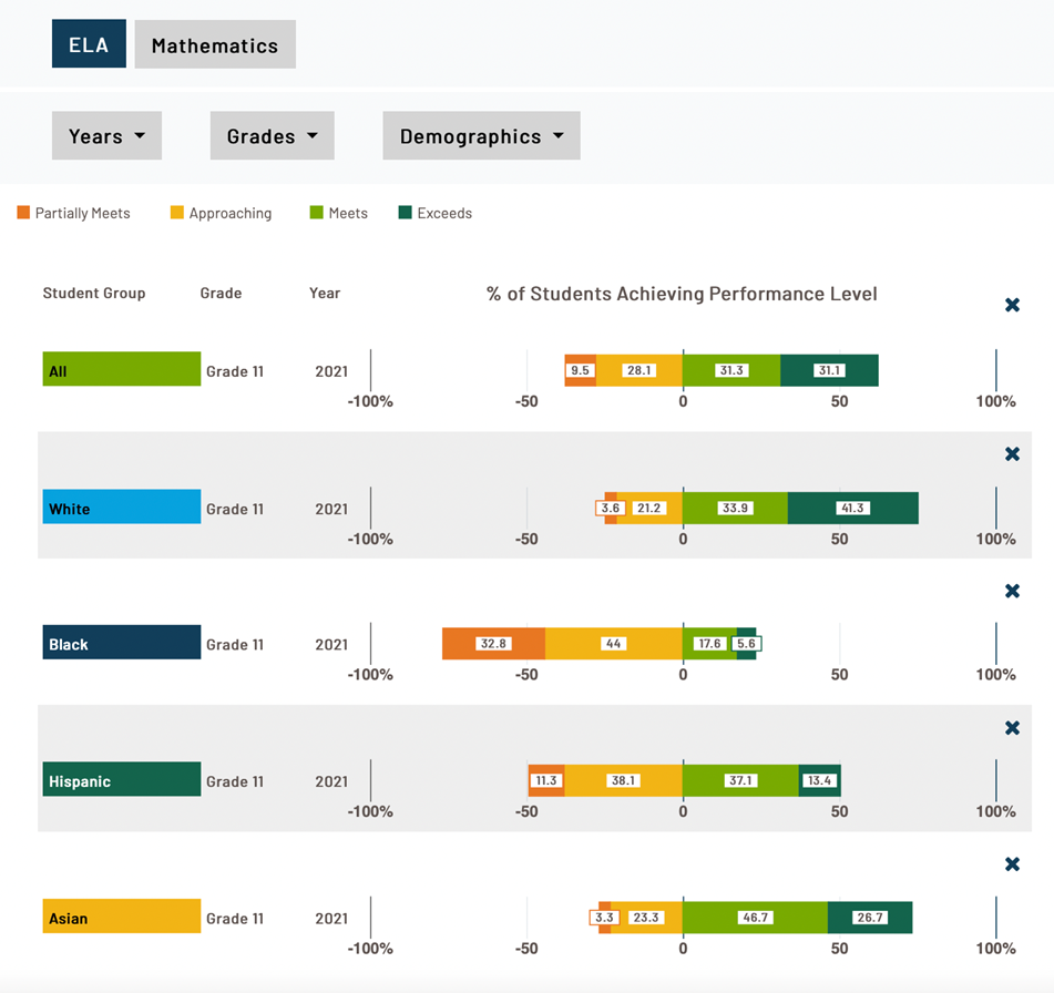 Let’s back up for a moment, in order to introduce the evidence. The first main exhibit is the OPRF High School SAT results. To see results by race, click “Demographics” and check the boxes. What you’ll find: On the 2021 SAT reading test (known as English Language Arts, or ELA) 62 percent of all District 200 students met the state benchmark of a 540 score or higher. Only 23 percent of black students met or exceeded the state benchmark in ELA on the SAT, versus 50 percent of Hispanics, 73 percent of Asians, and 75 percent of whites.