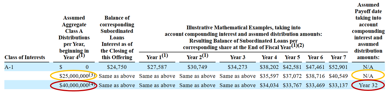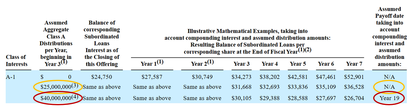 And that matters because the loan, if unpaid, grows dramatically each year. Don’t take it from me. The company provided three payout examples in its registration statement Form S-1.