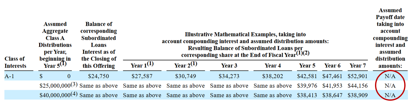 To understand how messed up this investment is, if the company has no money to distribute toward our group of investors for the first seven years, my loan, which starts at $24,750, will have ballooned to $52,901.