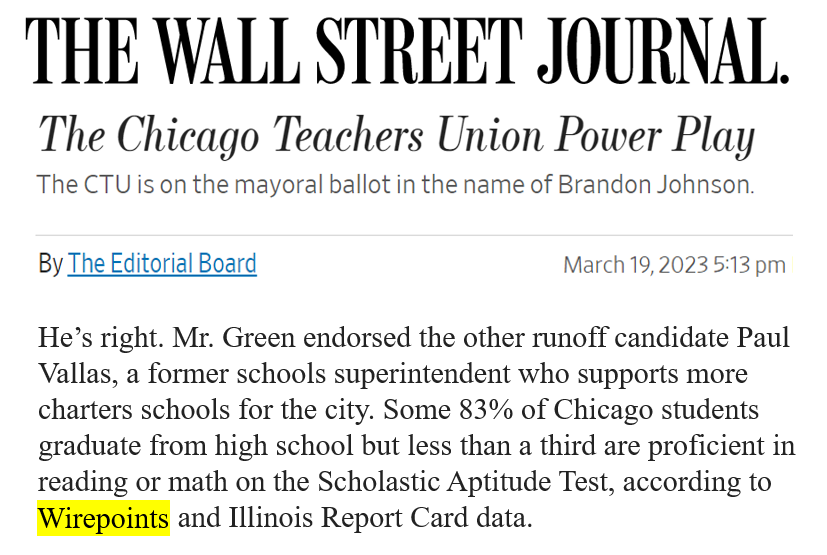 The Wall Street Journal Editorial Board cited Wirepoints’ education research in its new opinion piece about the Chicago mayoral election and why the CTU will run Chicago if their chosen candidate, Brandon Johnson, wins.