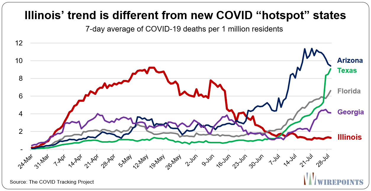 1. Illinois is in comparatively better shape than other states to reopen in-person schools. While Illinois had one of the country’s highest per-capita death rates just two-and-a-half months ago, on August 2 the state reported just 14 deaths.