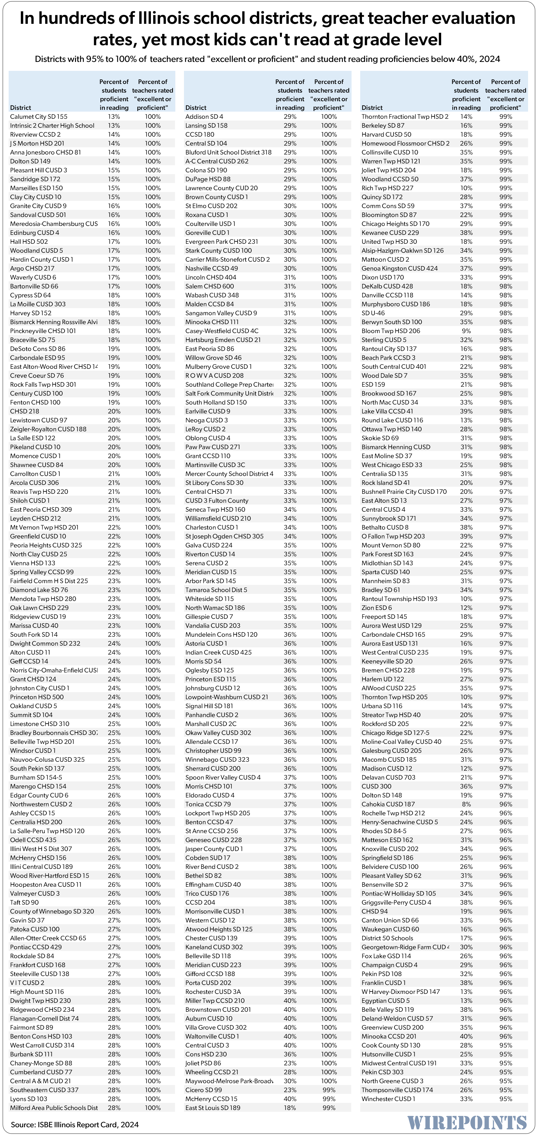 The below table shows what things look like for 20 of the worst-performing Illinois school districts, based on the percent of kids able to read at grade level. In all of them, fewer than 20% of students are reading proficient, yet 100% of teachers were rated as “excellent or proficient” in 2024.