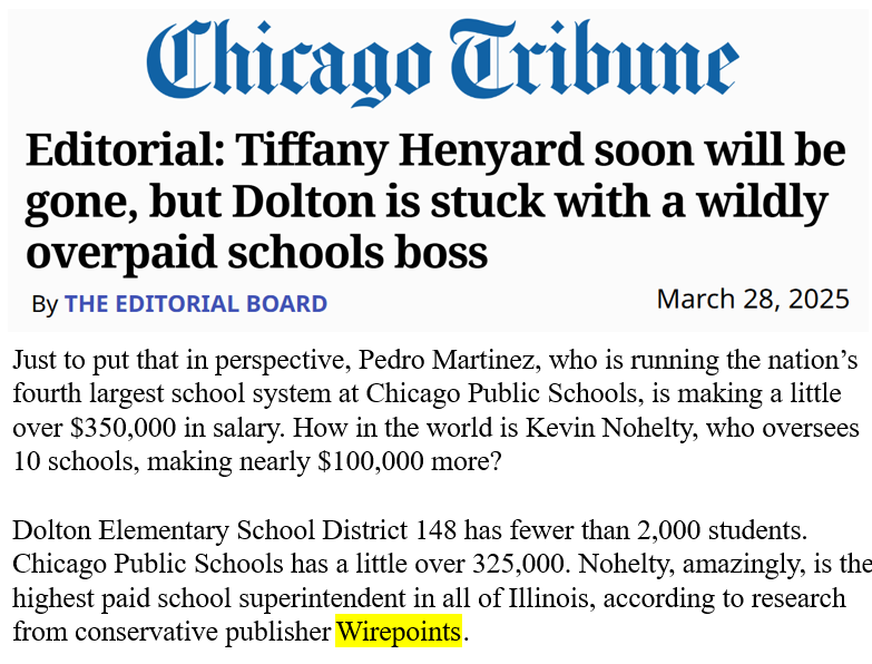 The Chicago Tribune cited Wirepoints’ research on superintendent salaries to decry the disconnect between the compensation that top school district administrators receive from taxpayers versus the actual reading and math outcomes in their districts.