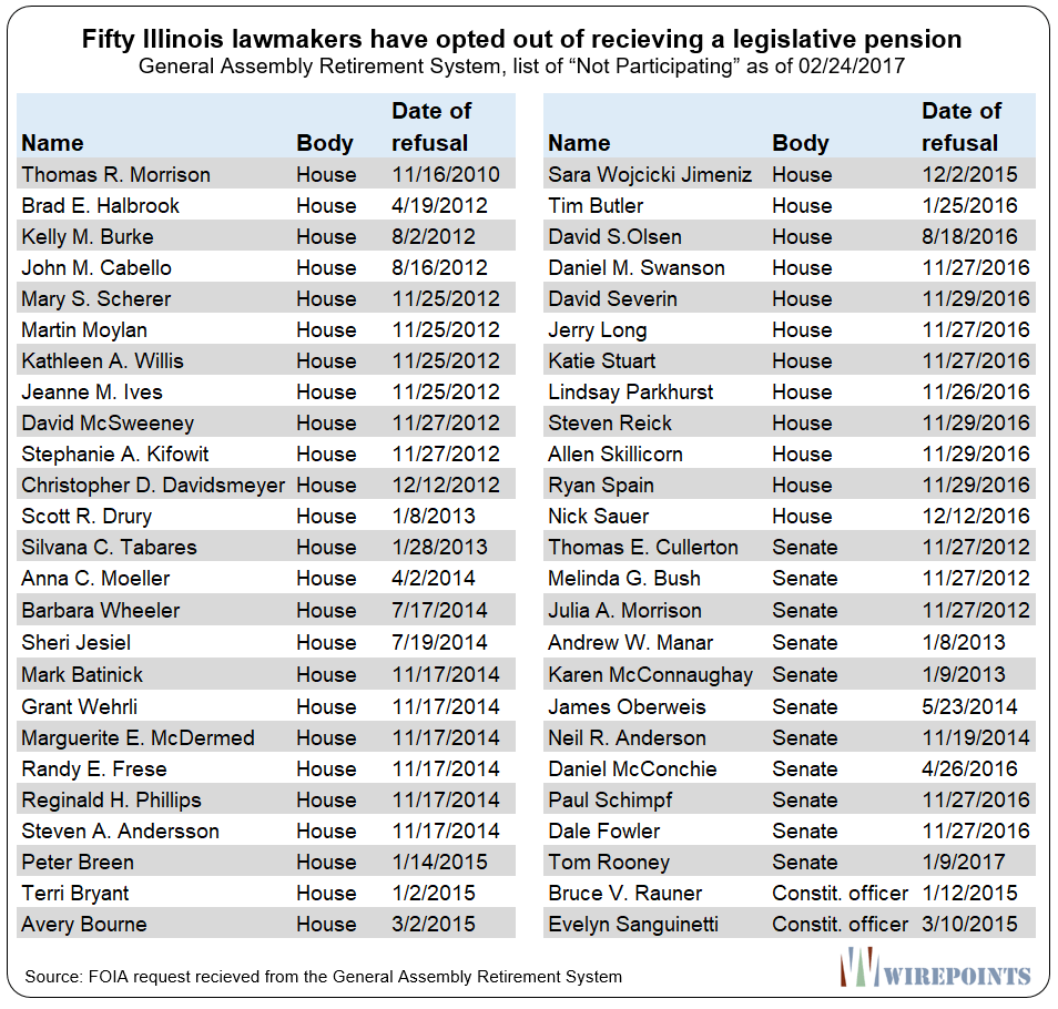 We’re working with State Representatives Jeanne Ives and Tom Morrison, who for years have provided leadership in supporting pension reforms and who themselves refused to accept a pension when they joined on to identify candidates on both sides of the aisle who will make this commitment.