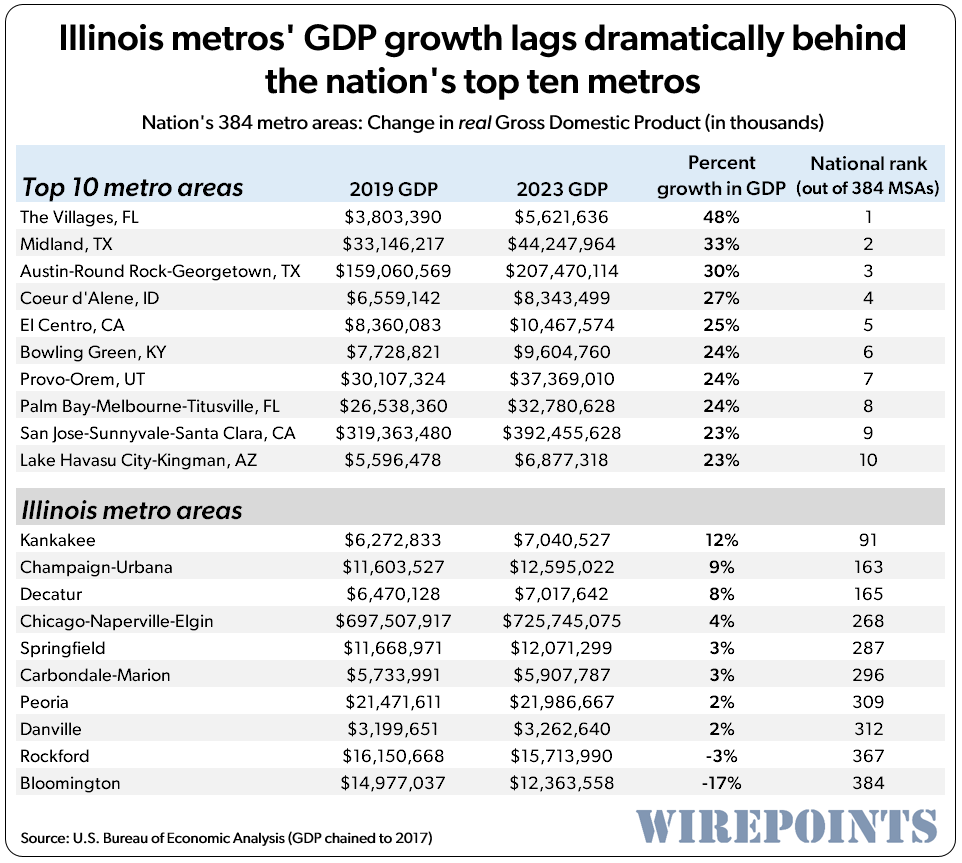 That’s an anecdote, but the data we’ve pulled up shows it’s anything but. Economic growth in Illinois’ metro areas has been sucking wind for a long time, but in this piece we focus on growth since 2019.