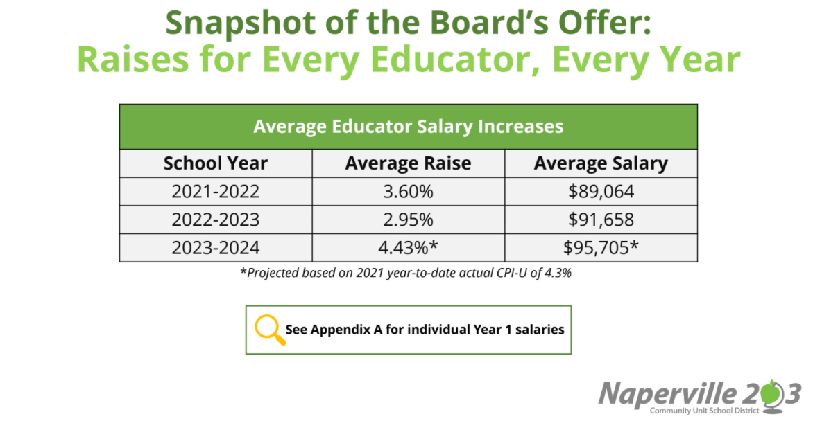 One of the most lucrative parts of multi-year contracts are the guaranteed raises public sector workers get. Naperville 203 offered their teachers’ union average annual raises of 3 to 4 percent each year through 2024, according to the district’s latest public offer. Those raises include both the average annual base increase and the average step increase for district teachers.